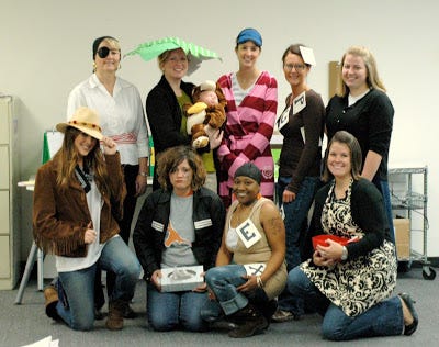 To make a long story very short, Happy Halloween from a Pirate, a Monkey in a Banana Tree, a Sleepy Co-worker, a Scrabble Board and her Missing Pieces, a Sock Hopper, Rachel Ray, a Very Sad Longhorn Fan (because they lost to OSU), and Miley Cyrus!