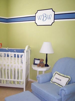 There is nothing preppier than a monogram. So, when Julie over at Lemon Tree Paperie sent me this photo of her newborn's nursery, I had to share it with you. Don't you love the green walls? Isn't the striped border crisp and elegant? Check out the Serena and Lily bedding! Are you drooling? Me, too!