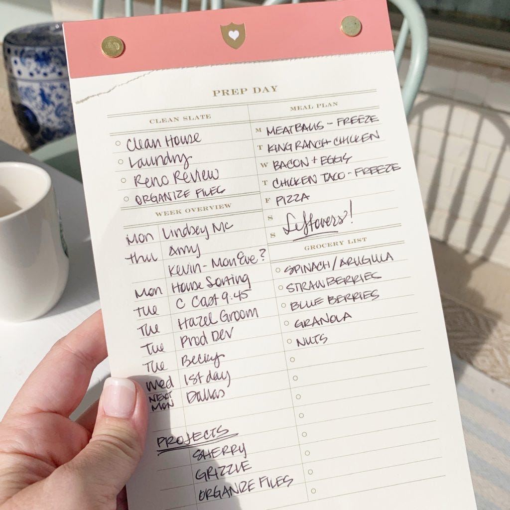 It’s amazing how magical writing things down can be. Every weekend I spend 10 minutes looking at my calendar, thinking through our week, and writing out a plan for the days ahead. I call it a prep day -- the day to get organized and meal plan, the day to mentally and physically prepare for the week ahead!